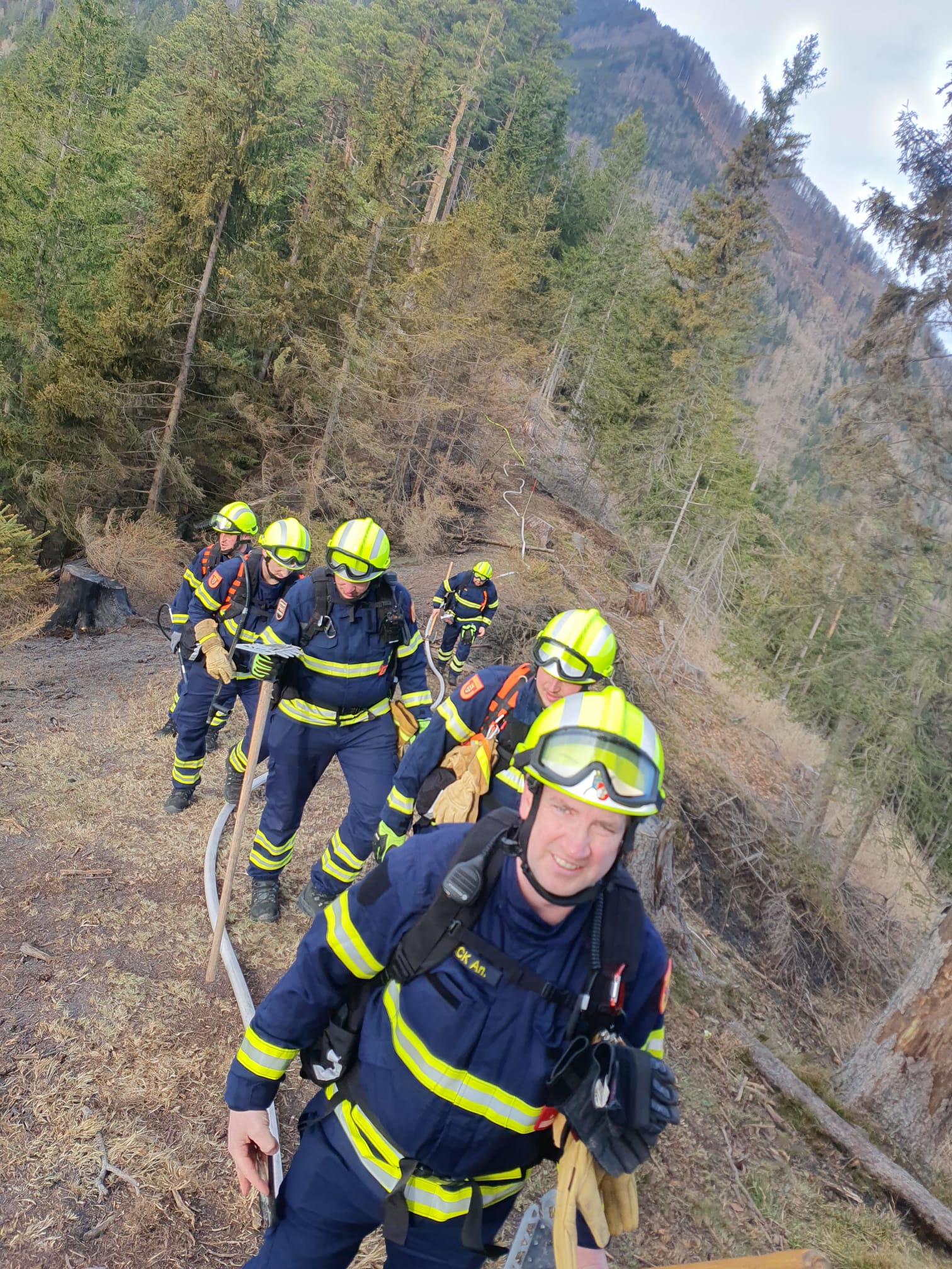 Vor Ort angekommen gab es eine Einweisung durch den Bereichseinsatzleiter. Im durchwegs steilen Gelände begann die anstrengende Arbeit der Sonderdienstmitglieder. Neben der Verlegung von hunderten Meter Schlauchleitung, dem Aufbau von mobilen Fallttanks sowie der Aufstellung diverser Pumpen welche die Wasserversorgung sicherstellten galt es das Löschwasser mit mehreren Tanklöschfahrzeugen im Pendelverkehr zu den Behältern zu transportieren. Diese Aufgabe stellte die Maschinisten aufgrund des engen Wegverhältnisse vor große Herausforderungen und verlangte den Fahrzeugen alles ab. Immer wieder fachte der starke Wind das Feuer erneut an und erschwerte die Löscharbeiten erheblich.
