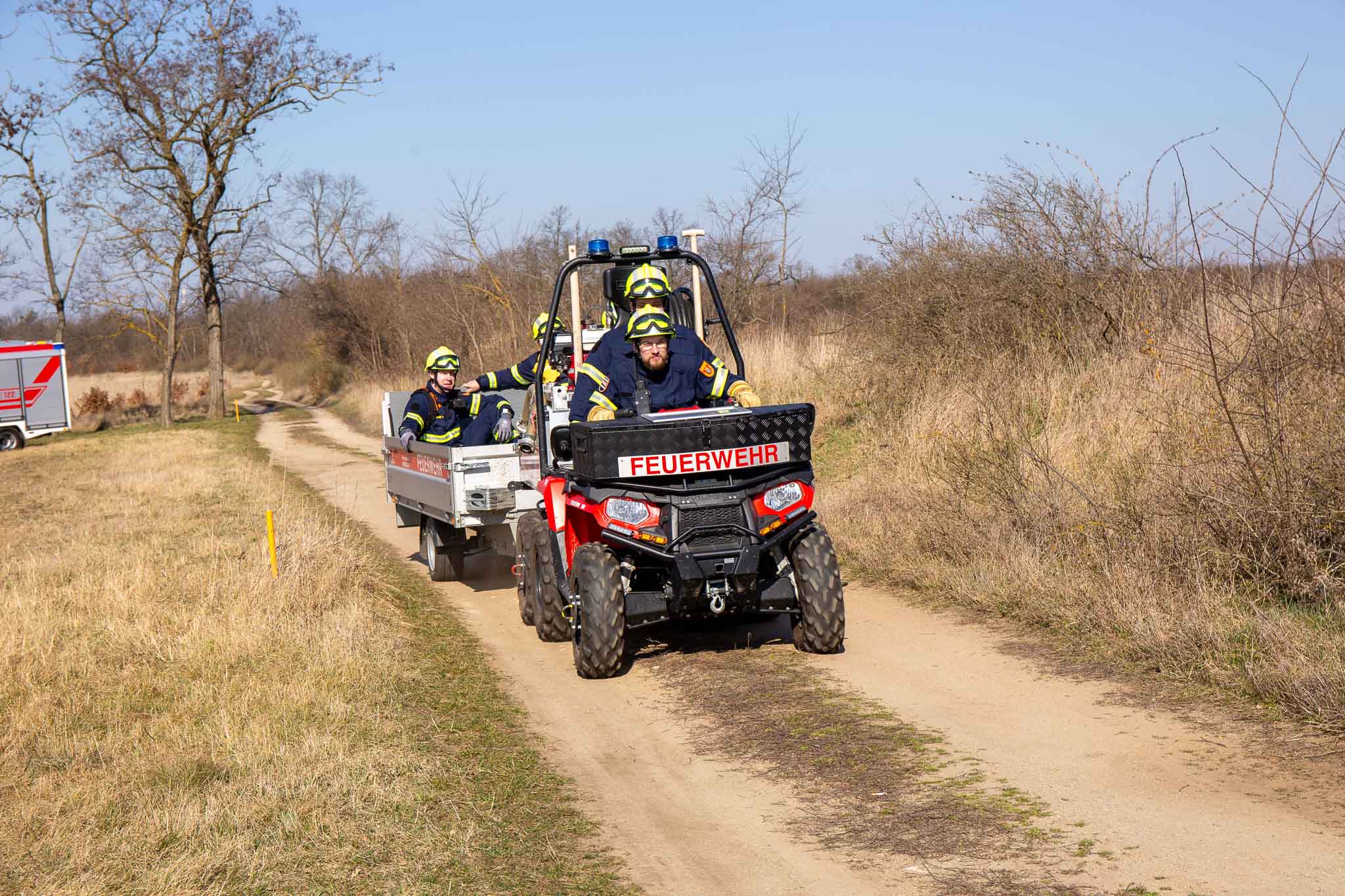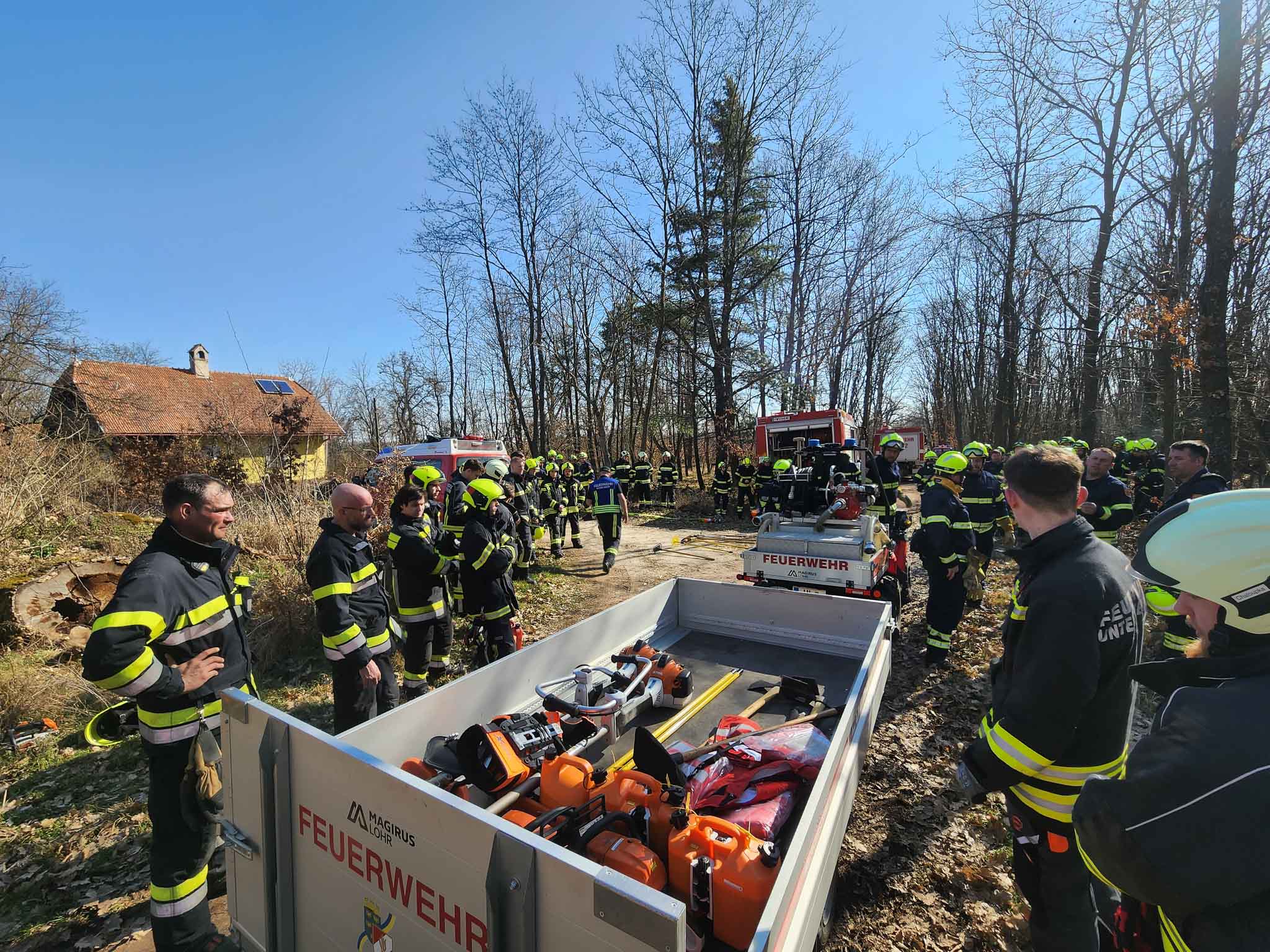 Zur Bekämpfung der Wald- und Flurbrände wurden zwei Riegelstellungen errichtet – eine entlang der Straße und eine weitere im Wald, die mithilfe von Spezialwerkzeugen und Fahrzeugen des Sonderdienstes Wald- und Flurbrandbekämpfung (WFBB) per Hand gezogen wurde. „Die Einsatzkräfte haben gezeigt, dass sie auch unter schwierigen Bedingungen absolut professionell agieren. Die taktische Umsetzung der Riegelstellungen und der Umgang mit der Spezialausrüstung waren vorbildlich. Die Kombination aus Technik, Taktik und körperlicher Ausdauer ist bei einem Waldbrandeinsatz entscheidend.“, so der Leiter des WFBB, OBI Manfred Trautner.