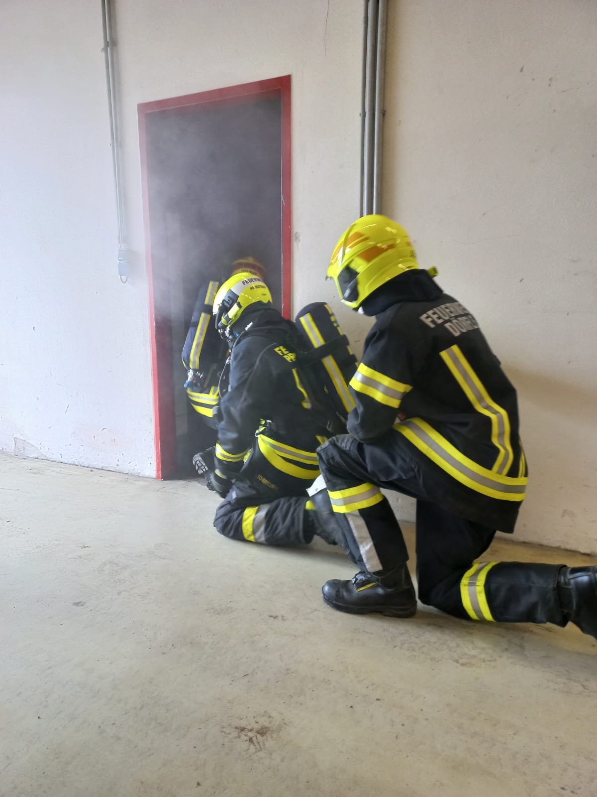 2. Türcheck: Möglichkeiten eine Türe möglichst gefahrlos zu öffnen und mit einer Löschleitung und einem Hohlstrahlrohr einen Zimmerbrand zu bekämpfen.